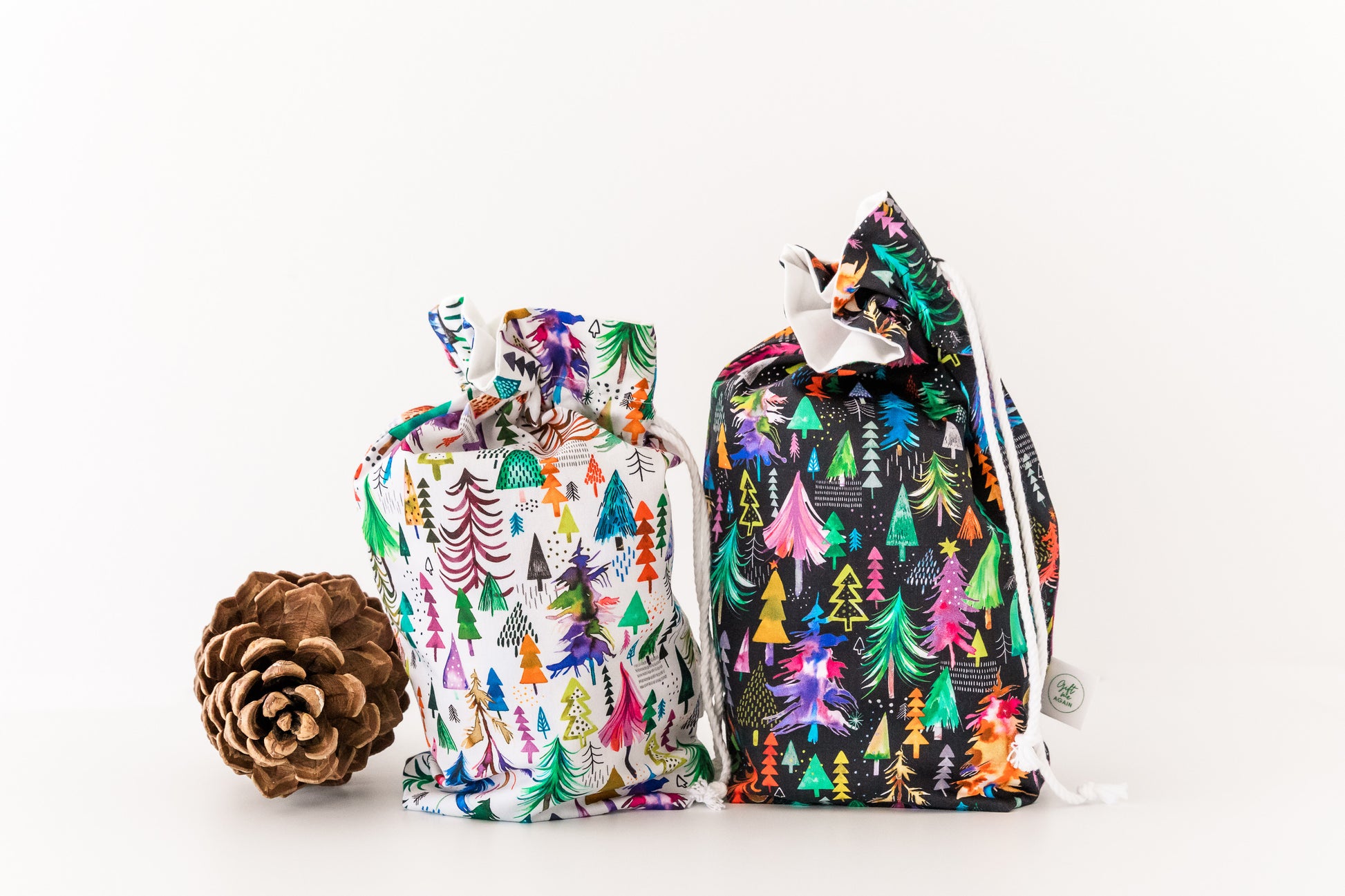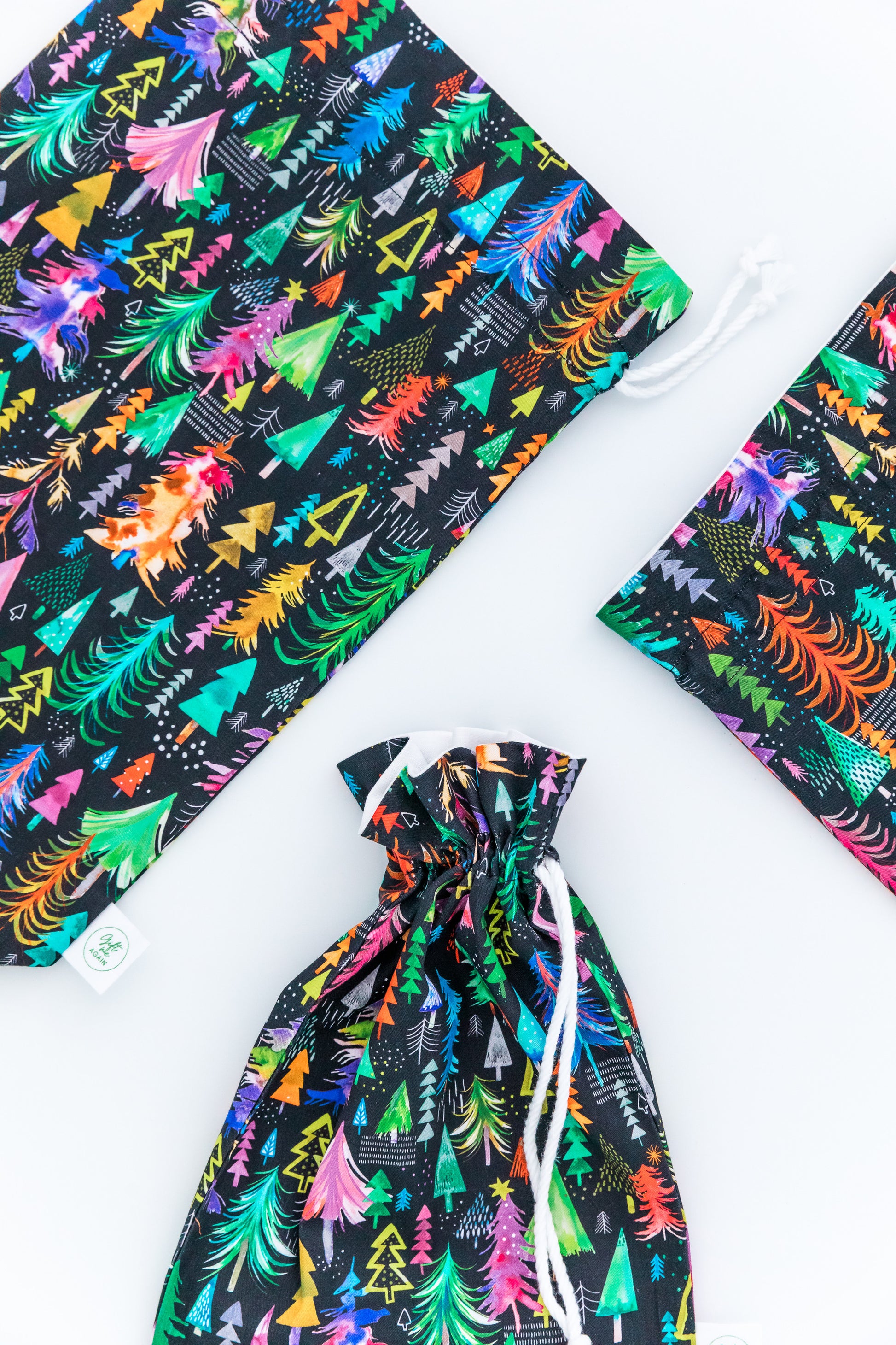 Make your Christmas gifting unforgettable with our Black Forest fabric gift bag. Bursting with colourful, hand-drawn Christmas trees set against a bold black background, this reusable bag brings festive magic with a modern twist. Handmade from 100% cotton and finished with a built-in drawstring tie, it’s quick to use, waste-free, and designed to be enjoyed year after year. The perfect eco-friendly alternative to wrapping paper for toys, books, and festive treasures.