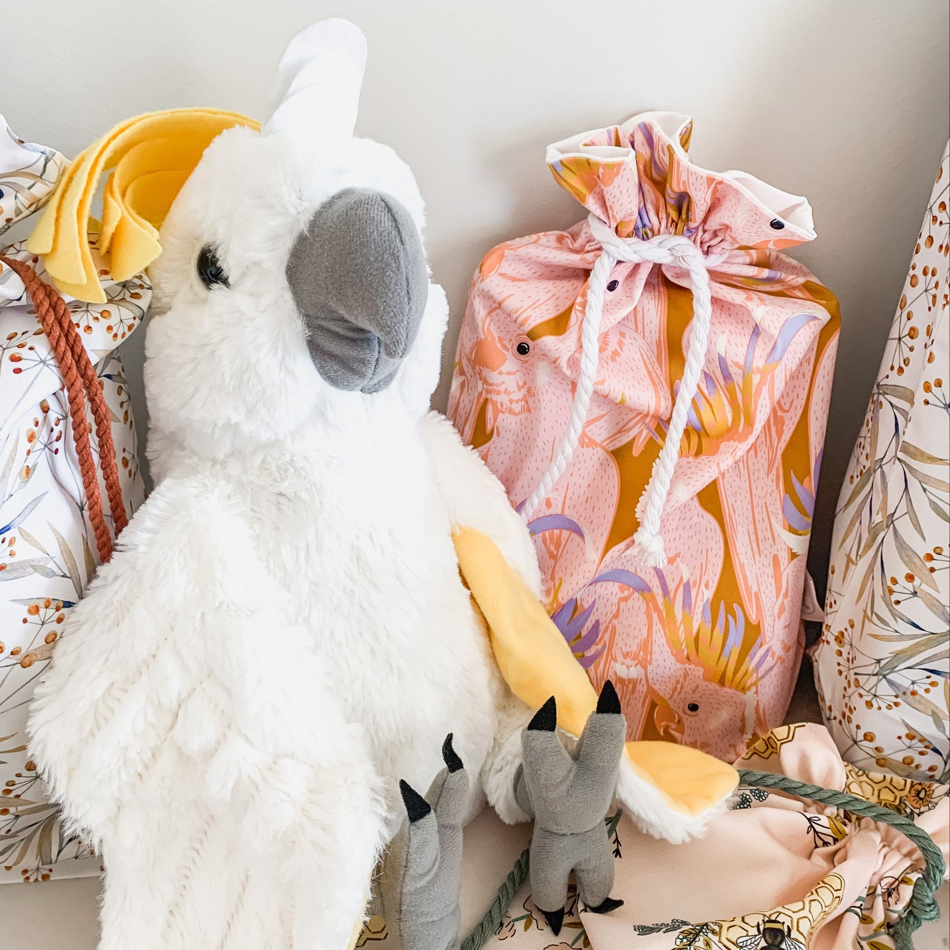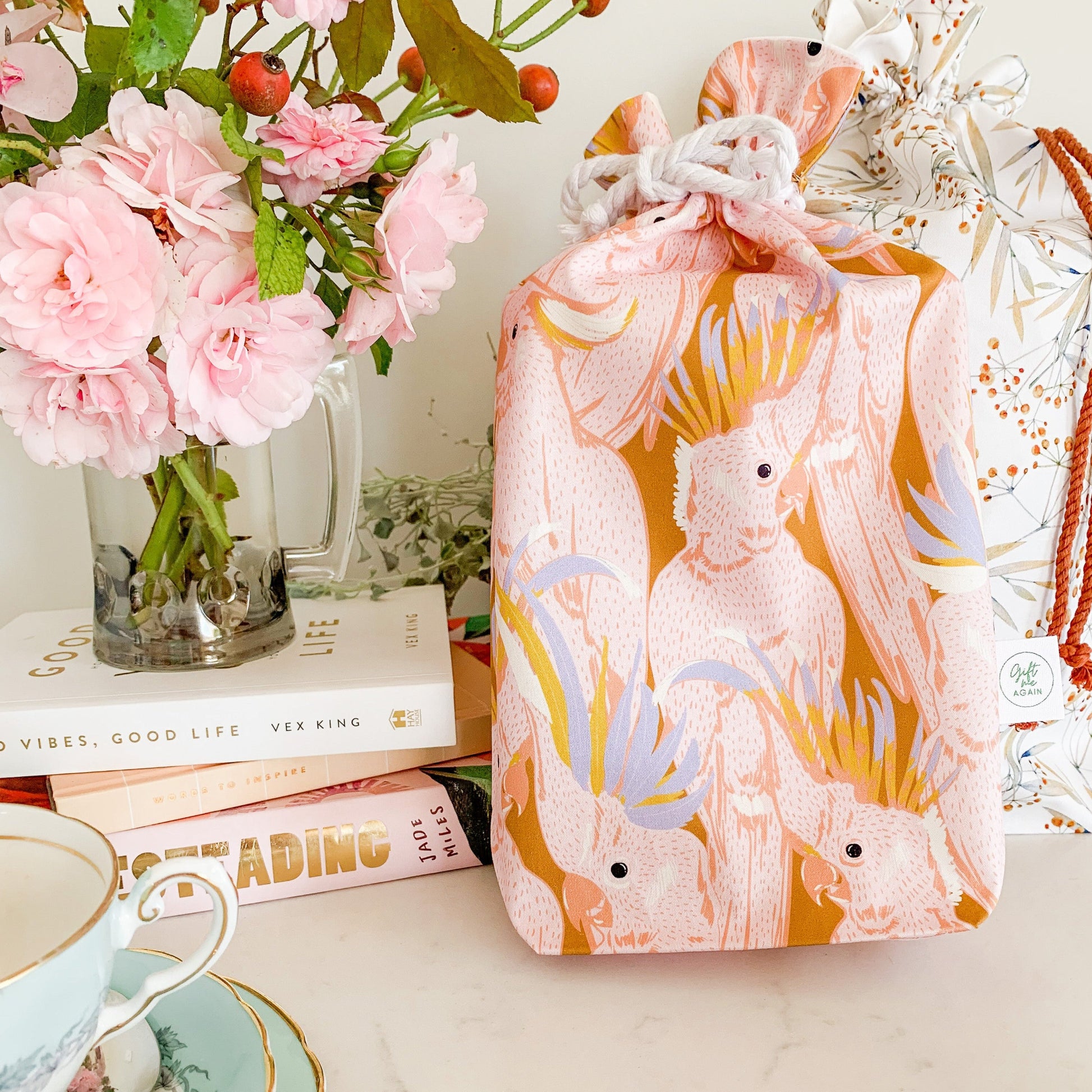 Best seller Bring a burst of Australian colour to your gift giving with our best selling Cockatoo Fabric Gift Bag. Printed with soft pink cockatoos, golden crests and hints of lilac on a peachy background, this reusable cotton bag is as joyful as it is practical.