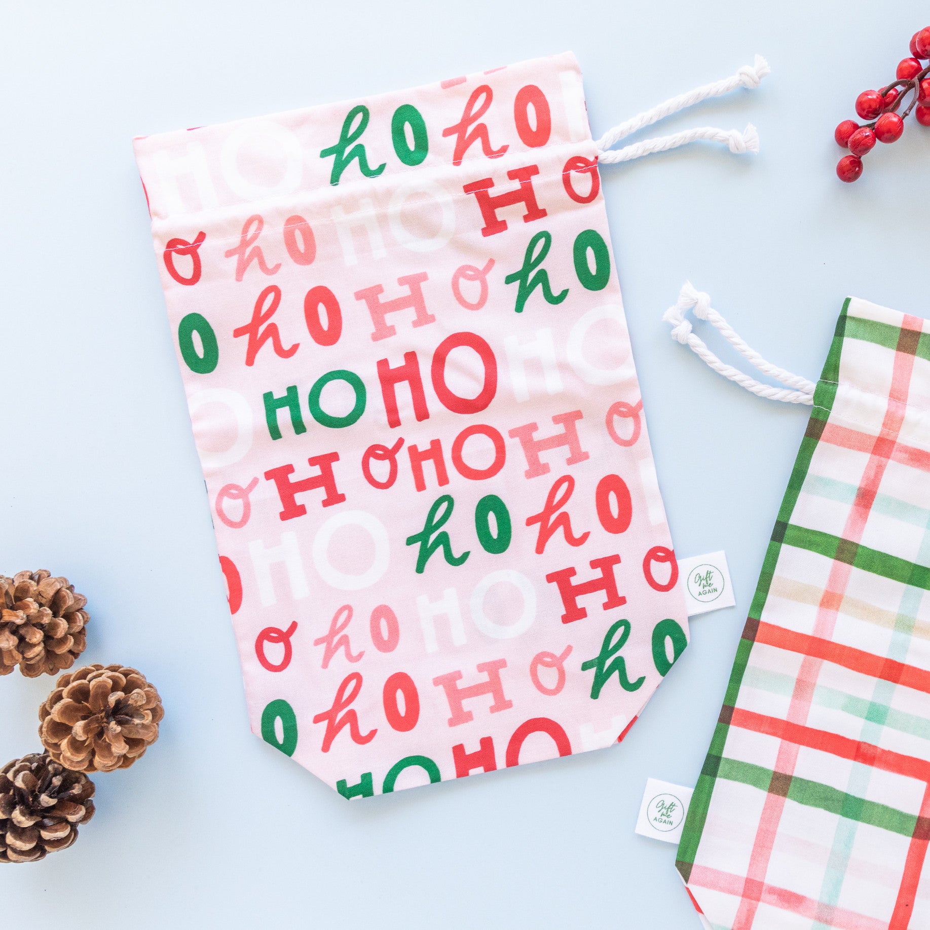 Featuring a vibrant pink background with bold "Ho Ho Ho" text, this bag brings playful cheer to any gift. Perfect for adding a pop of color under the tree, it’s made from eco-friendly fabric, offering a stylish and sustainable alternative to traditional wrapping paper